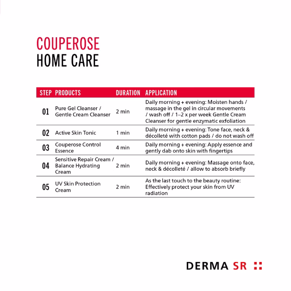 Uporaba: Na očiščene, želene predele kože nanesite tanek sloj esence Couperose Control. Zvečer lahko uporabite nekoliko večjo količino. Esenco z nežnim pritiskom in gladilnimi gibi vdelajte v kožo, brez segrevanja ali draženja. Tako se aktivne sestavine enakomerno nanesejo, njihova absorpcija pa je optimalna. Zaradi hitro vpojne teksture lahko nato nanesete kremo Sensitive Repair ali ličila. Če izdelek uporabljate podnevi, rutino zaključite z UV Skin Protection Cream in Skin Glow Complex kot zaščito pred soncem.