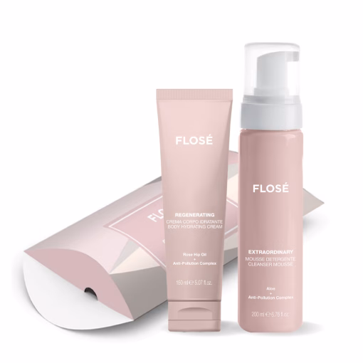 Darilni set vsebuje Flose Extraordinary Foam, Flose Regenerating Body Cream in darilno embalažo.