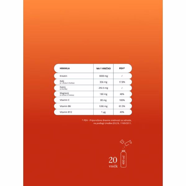 Vsaka doza vsebuje 3 g kreatin monohidrata, skupaj z bistvenimi elektroliti in vitamini.