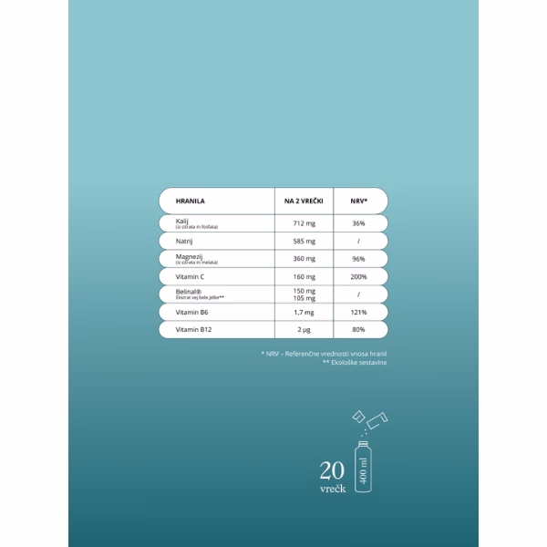 - 712 mg – KALIJ – Pomaga telesu uravnavati raven natrija in preprečevati napihnjenost ter podpira delovanje mišic in okrevanje po naporu.