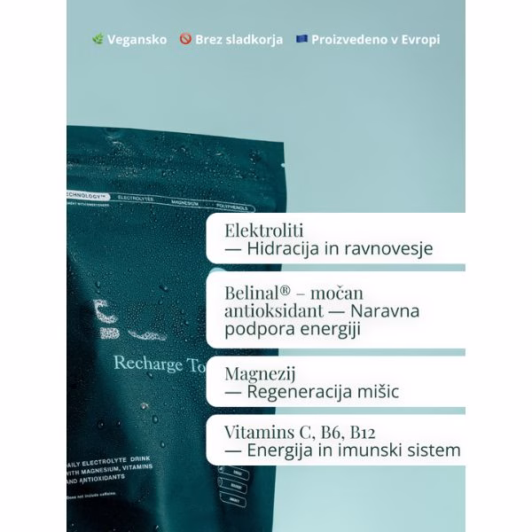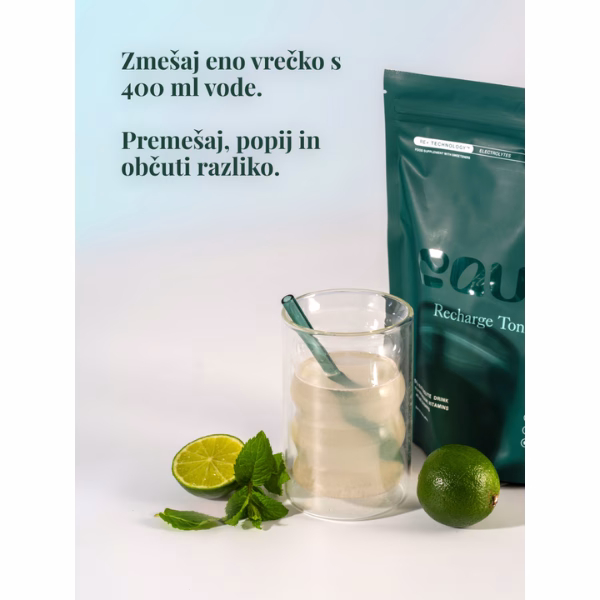 - BOLJŠA HIDRACIJA – Opazila boš globljo in dolgotrajnejšo hidracijo, saj Recharge tonik nadomešča ključne elektrolite, kot so magnezij, kalij in natrij, kar telesu pomaga hitreje vpijati vodo in ohranjati ravnovesje skozi ves dan.