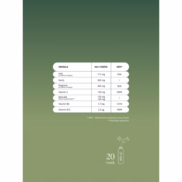 - 712 mg – KALIJ – Pomaga telesu uravnavati raven natrija in preprečevati napihnjenost ter podpira delovanje mišic in okrevanje po naporu.