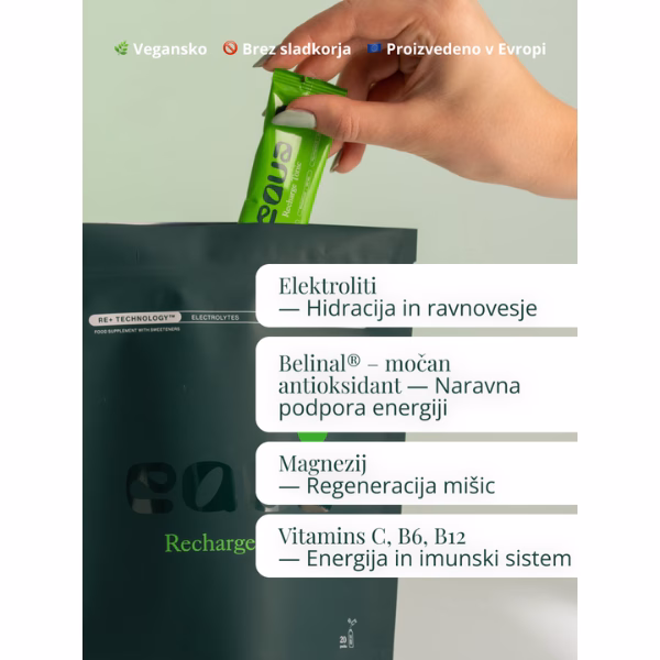 - BOLJŠA HIDRACIJA – Opazila boš globljo in dolgotrajnejšo hidracijo, saj Recharge tonik nadomešča ključne elektrolite, kot so magnezij, kalij in natrij, kar telesu pomaga hitreje vpijati vodo in ohranjati ravnovesje skozi ves dan.