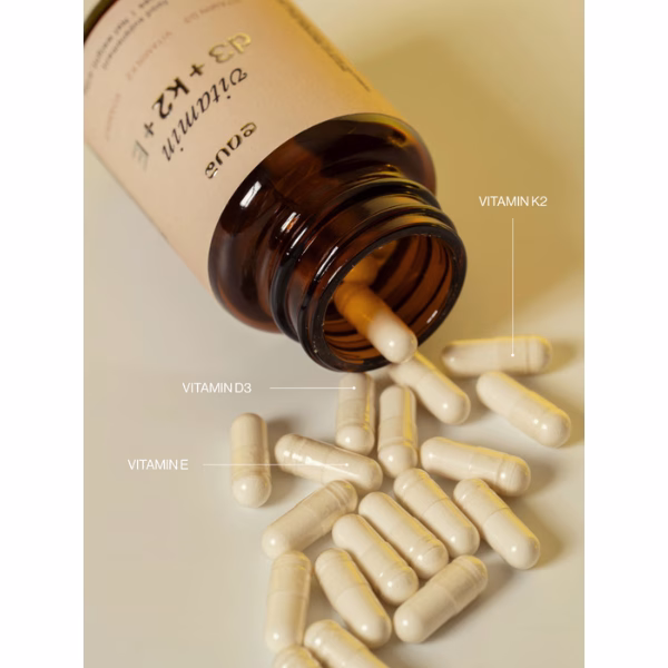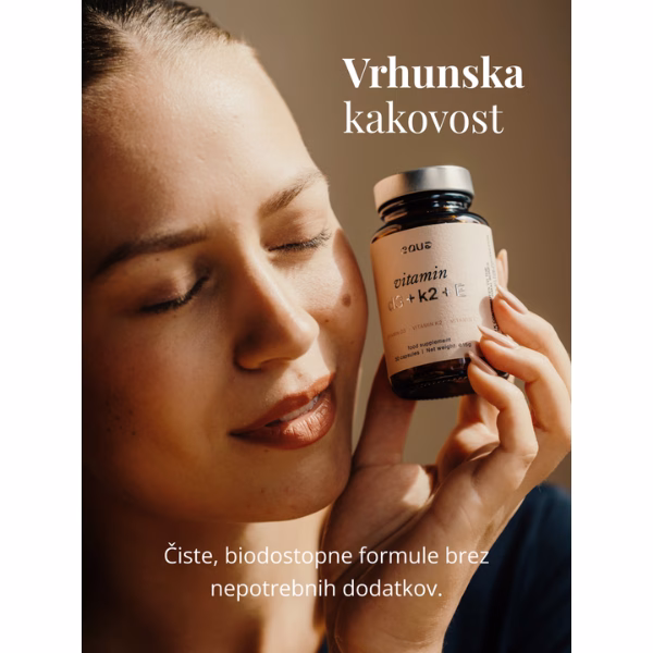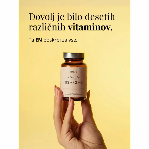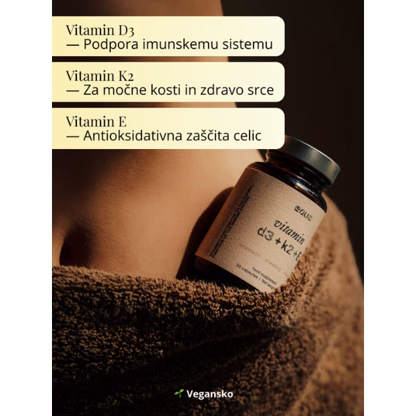 Vitamin D3 pomaga tvojemu telesu absorbirati kalcij, medtem ko K2 poskrbi, da ta potuje v kosti in ne v arterije, s čimer podpira tako zdravje srca kot kosti. Vitamin E doda plast antioksidativne zaščite, ki pomaga zmanjševati vnetja in ohranja tvoje celice zdrave.